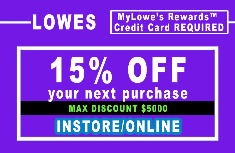 ** MyLowe’s Reward Credit CARD REQUIRED** Save 15% off your next purchase at lowes.com or IN STORE using MyLowe’s Reward Credit CARD as payment. MAX Saving $5000